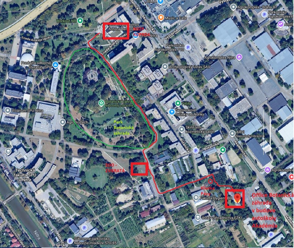 Riaditeľstvo a administratíva Botanickej záhrady SPU sídli v budove Autoškoly Akadémia na adrese: Akademická 8, 949 76 NITRA Nitra-Chrenová